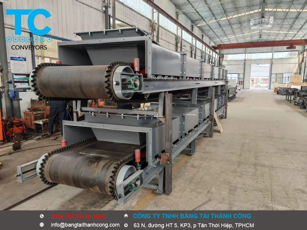 - Khi Băng tải cấp liệu tai bèo được bố trí theo chiều dọc, máy thường được bao bọc hoàn toàn, có khả năng bịt kín tốt, ít bụi và có tác dụng bảo vệ môi trường rõ rệt.