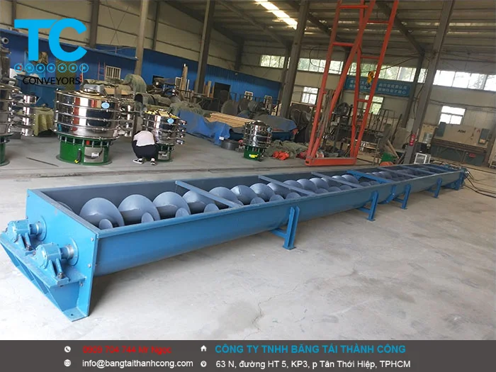 - Mô tả chung về sản phẩm băng tải trục vít đôi có Cấu trúc của băng tải trục vít đôi tương tự với băng tải trục vít đơn; sự khác biệt chính của hai là chiều dài di chuyển của băng tải trục vít đôi thường ngắn hơn. Có hai trục vít song song trong máng. Trong quá trình vận hành, hai trục quay bởi hai bánh răng tham gia, làm cho vật liệu di chuyển theo chiều dọc và vật liệu đó được truyền ra ngoài.