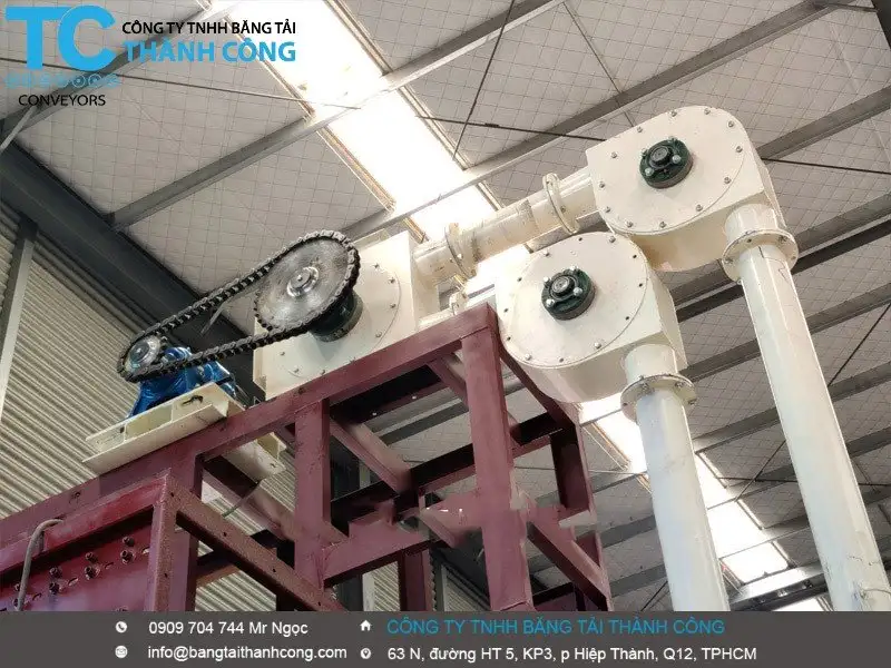 - Bộ truyền động: Bao gồm động cơ, hộp giảm tốc, đĩa xích, trục truyền động, ổ bi và vỏ truyền động. Vỏ truyền động được phân loại thành ba loại chính theo điều kiện làm việc: loại thông thường, loại kín và loại chịu nhiệt cao. Vỏ loại chịu nhiệt cao được trang bị hệ thống làm mát ổ bi.