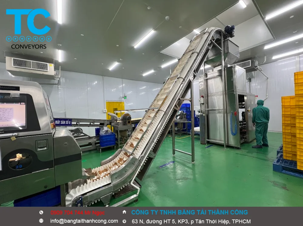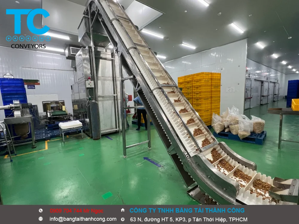 - Băng tải cao su: Độ bền cao, chịu tải tốt, phù hợp cho việc vận chuyển hạt điều thô từ kho bãi vào xưởng sơ chế. Băng tải xích nhựa/Modular: Dùng trong khâu đóng gói hoặc phân loại sản phẩm theo kích thước, trọng lượng