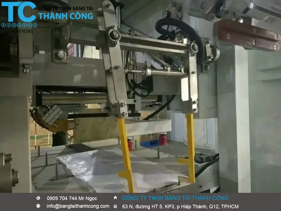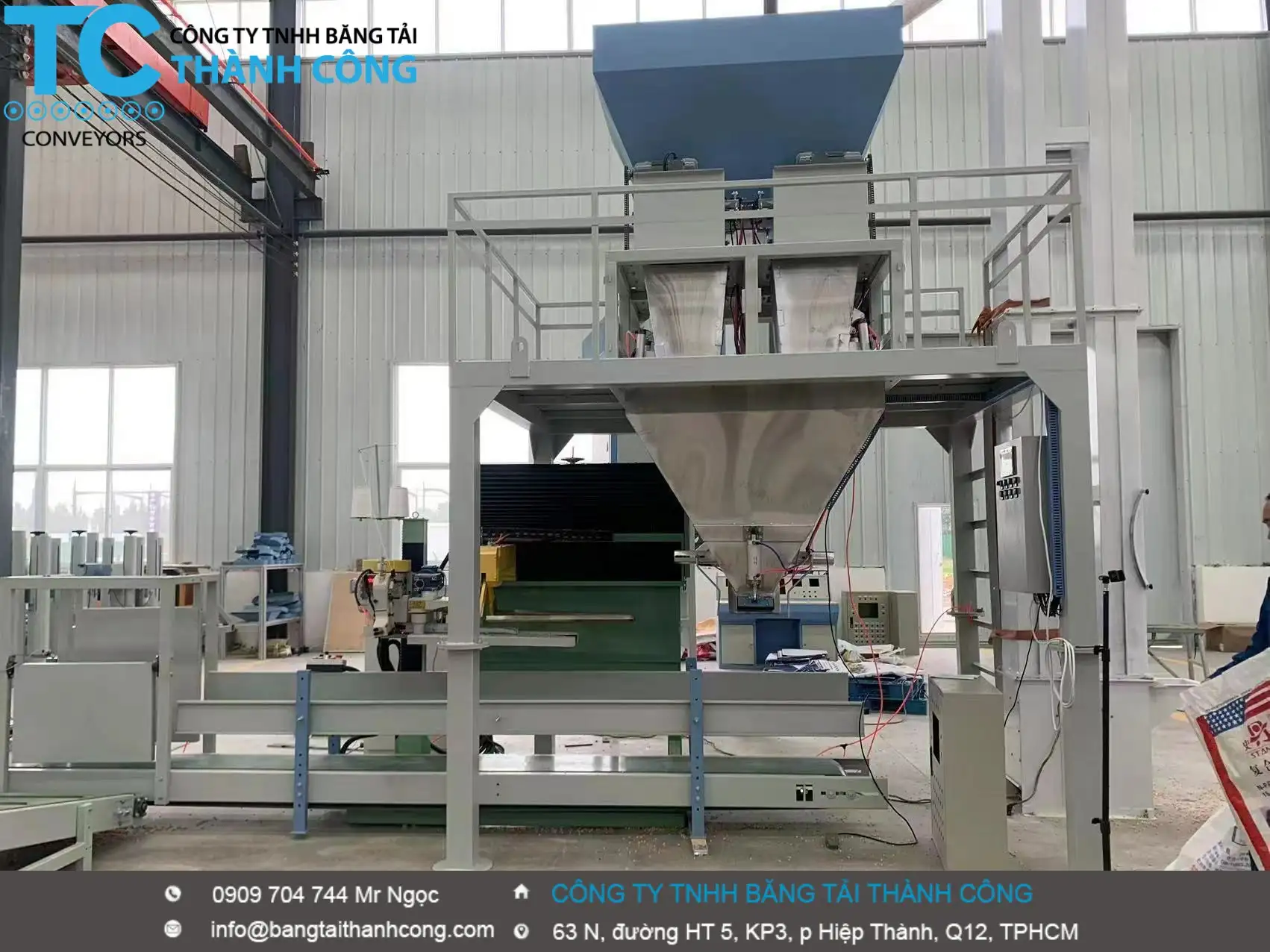 - Máy đóng bao bán tự động: Đây là loại phổ biến nhất. Công nhân sẽ thực hiện thao tác kẹp miệng bao vào vòi xả của máy. Máy sẽ tự động cân, xả đủ trọng lượng (25kg hoặc 50kg) và ngắt. Sau đó, bao được đưa qua hệ thống may miệng bao hoặc ép nhiệt (thường cần công nhân hỗ trợ).